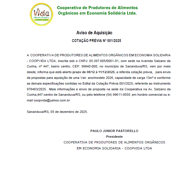 A Cooperativa de Produtores de Alimentos Orgânicos em Economia Solidária – COOPVIDA Ltda, CNPJ 05.397.605/0001-81, com sede na Avenida Salzano da Cunha, nº 447, Centro, CEP 99840-000, Sananduva/RS, torna público que está aberto o prazo de 08/12 a 11/12/2025 para envio de propostas referentes à Cotação Prévia nº 001/2025.